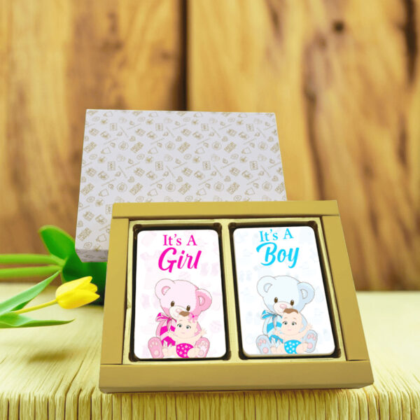 Make baby showers extra special with this premium chocolate box, designed with delicate pastel colors and adorable teddy bear illustrations. Inside, you’ll find two rectangular chocolate bars (117gm each, 126x80x10mm), elegantly housed in a Chocobreeze premium paper sleeve box (224x177x35mm, 294gm). Each chocolate bar is personalized with names, logos, photos, or heartfelt messages, making it a truly meaningful gift for celebrating new beginnings. 🎉✨