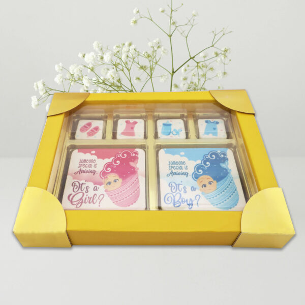 The medium-sized chocolates feature gender reveal designs, with one saying “It’s a Girl!” and the other “It’s a Boy!”, both accompanied by the text “Someone special is arriving.” The smaller chocolates showcase baby-themed illustrations, including baby shoes, a dress, a bottle, and a onesie, making it a truly delightful gift for loved ones. 🎉✨