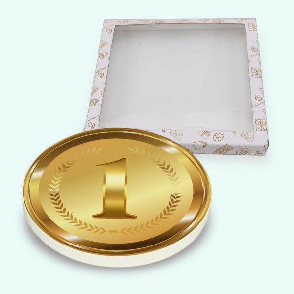 Enclosed in a sleek white box with a transparent window, the design showcases the chocolate’s artistry even before it’s opened. Gold motifs of victory symbols—medals, stars, trophies—elevate the presentation, making it a standout at award ceremonies, corporate events, or leadership retreats.