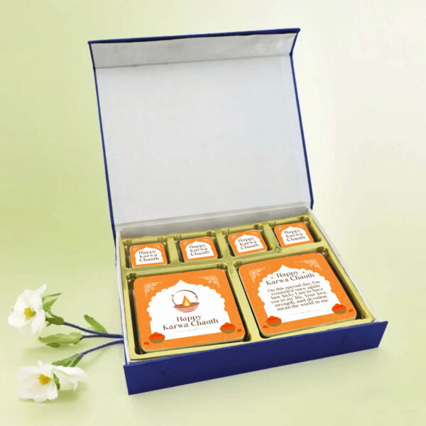 Make Karva Chauth celebrations truly special with this premium chocolate box, designed with traditional motifs and heartfelt messages that capture the essence of the festival. Inside, you’ll find two medium-sized square chocolate bars (75gm each, 80x80x10mm) and four square bites (12gm each, 31x31x10mm), elegantly housed in a Luxury Satin Rigid Box (197x154x35mm, 448gm).