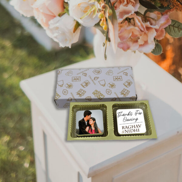 Make wedding return gifts extra special with this premium chocolate box, designed with sophisticated wedding-themed illustrations that capture the joy of the occasion. Inside, you’ll find two square chocolate bites (12gm each, 31x31x10mm), elegantly housed in a Chocobreeze Premium Paper Box (99x50x16mm, 32gm).
