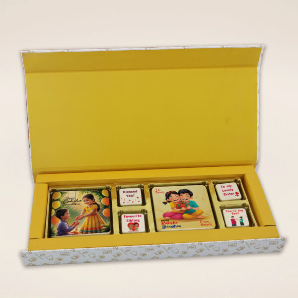 Make Rakshabandhan celebrations extra special with this premium chocolate box, designed with vibrant festive illustrations and meaningful messages that capture the essence of sibling love. Inside, you’ll find two medium-sized square chocolate bars (75gm each, 80x80x10mm) and four square bites (12gm each, 31x31x12mm), elegantly housed in a Chocobreeze Premium Rigid Box (334x136x35mm, 395gm).