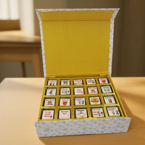 Celebrate the bond of siblings with a luxurious box of 20 personalized chocolate bites. Each square-shaped delight, customizable with names, logos, photos, or messages, is elegantly packed in a Chocobreeze Luxury Rigid Box —perfect for Rakshabandhan gifting. 🎁🍫