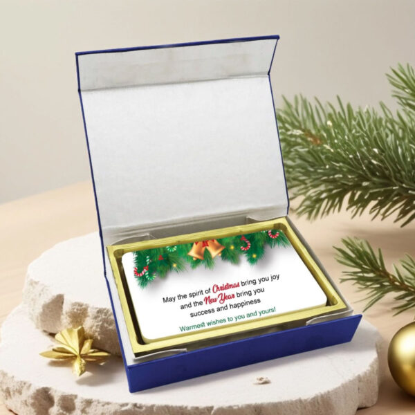 Share the warmth of the season with a delightful Christmas-themed chocolate gift. This elegant box contains one large rectangular chocolate that can be customized with your name, logo, message, or photo—making it a truly memorable gift.