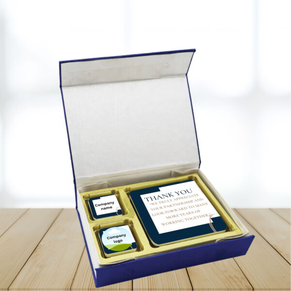 Designed to convey heartfelt appreciation, this premium chocolate box is ideal for corporate thank-you gifting. It includes one medium-sized square chocolate bar (75gm, 80×80×10 mm) and two square bites, all housed in a luxury satin rigid box (150×107×35 mm, 183gm). The main bar features a message that reads: “THANK YOU. WE TRULY APPRECIATE YOUR PARTNERSHIP AND LOOK FORWARD TO MANY MORE YEARS OF WORKING TOGETHER”.