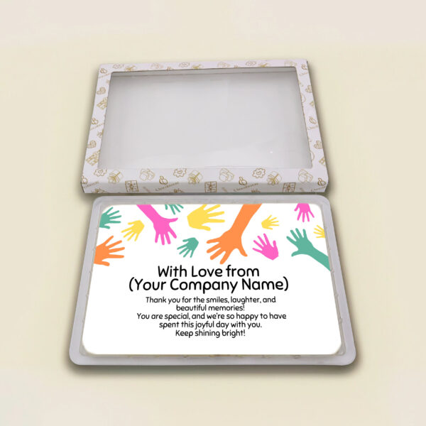 Make CSR activities more impactful with this premium chocolate box, designed with thoughtful branding elements and appreciation messages that reflect your company’s commitment to social responsibility. Inside, you’ll find one rectangular chocolate bar (120gm, 100x150x7mm), elegantly housed in a Chocobreeze Premium Paper Box with Window (165x116x12mm, 146gm).