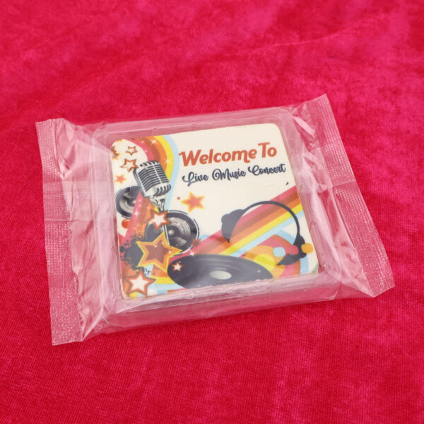 Make music concerts extra special with this premium chocolate pouch, designed with vibrant musical notes and a celebratory welcome message that captures the excitement of live performances. Inside, you’ll find one square chocolate bite (37gm, 73x73x6mm), elegantly housed in a transparent sealed pouch (100x92x10mm, 40gm).